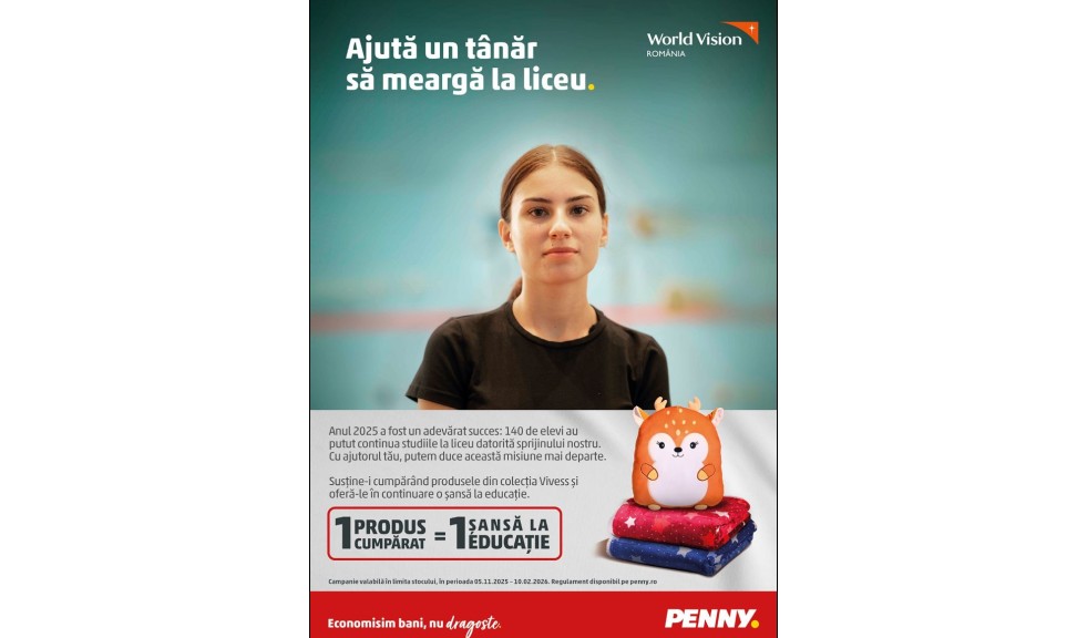 Începând cu această lună, rețeaua de magazine PENNY desfășoară o nouă campanie de loializare care include o colecție de produse textile sub marca Vivess, destinată sezonului rece. Campania are și o componentă educațională, prin susținerea programului „Vreau în clasa a 9-a”, derulat de World Vision România.