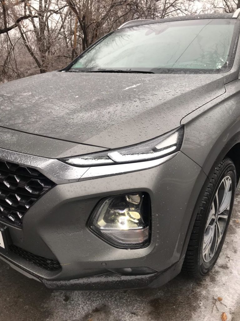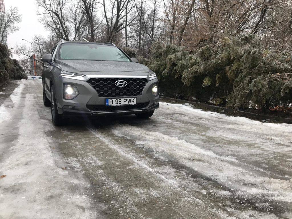 Am plecat cu mașina spre un drum de macadam. Hyundai SantaFe a surfat ca pe șosea peste gheața care acoperea drumul, zgomotul pătrunde în mod limitat în interior, iar suspensia ține mașina rigidă, dar confortabilă pentru pasageri.