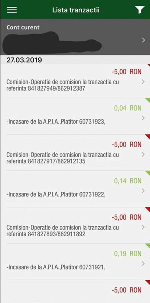 Mihai Bratosin din Brăila a postat pe Facebook mai multe capturi cu situația bancară. Se vede cum din partea APIA apar viramente foarte mici, taxate însă de bancă cu comision fix de 5 lei.